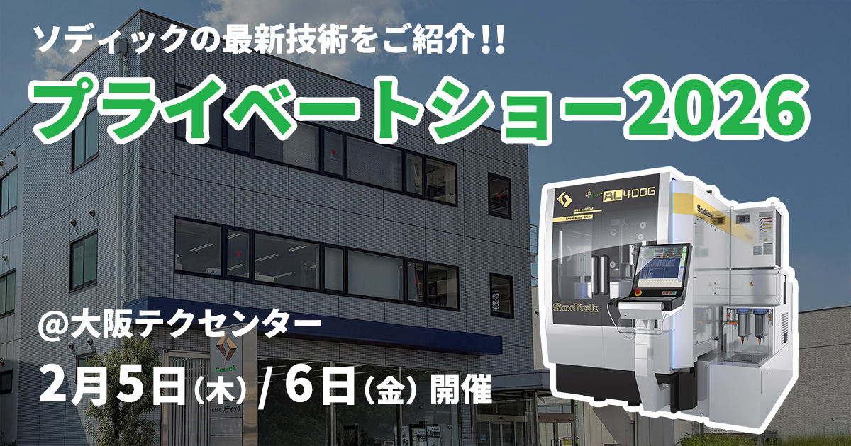 イベント情報 HOMEイベント情報 近日開催予定の展示会 TCT Japan 2026開催日:1月28日(水)~30日(金)会場:東京ビッグサイトTCT Japan は、3Dプリンティング・AM技術の総合展です。ソディックブースでは、プラスチック射出成形金型やダイカスト金型、ADC12の試作品といったさまざまな造形サンプルをご覧いただけます。※TCT Japan公式ページへリンクします。国内【プライベートショー】V-LINE サーキュラーエコツアー@横浜開催日:1月28日(水)/29日(木)会場:株式会社ソディック 本社/技術・研修センターサーキュラーエコノミーを実現するソディックの最新技術を展示いたします。また製品の展示だけでなくセミナーも開催いたします。国内ソディック西日本支店プライベートショー2026開催日:2月5日(木)/6日(金)会場:株式会社 ソディック 西日本支店 大阪テクセンター国内【プライベートショー】V-LINE サーキュラーエコツアー@大阪開催日:2月5日(木)/6日(金)会場:株式会社 ソディック 西日本支店 大阪テクセンターサーキュラーエコノミーを実現するソディックの最新技術を展示いたします。また製品の展示だけでなくセミナーも開催いたします。 展示会アーカイブ 2025年2024年2023年2022年2021年