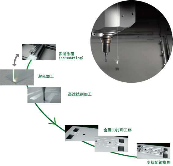 将金属粉末均匀涂覆(多层涂覆工序),再以激光照射该金属粉末使其熔融凝固。之后,通过使用旋转工具执行基于高速铣削的高精度精加工,可以获得仅靠层压造型所无法获得的高品质形状加工。