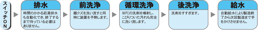 - 排水から前洗浄、循環洗浄、後洗浄、給水までを全自動化。洗浄終了まで待機の必要がなく、次回製造時まで手をかけることもありません。