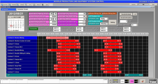 →自動スケジューリングを行い一日の生産工程を表示します。 - 複数ライン稼働時、各ライン上の装置の稼働開始時刻を指示します。