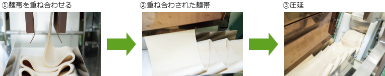 - 麺帯を重ね合わせながら圧延することで、グルテンが均一な網目状になります。これにより、麺は弾力のあるモチモチ食感になります。