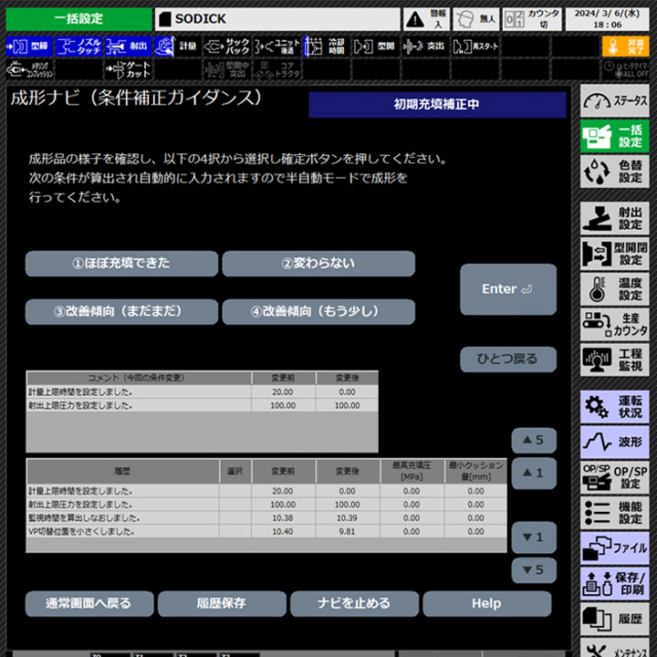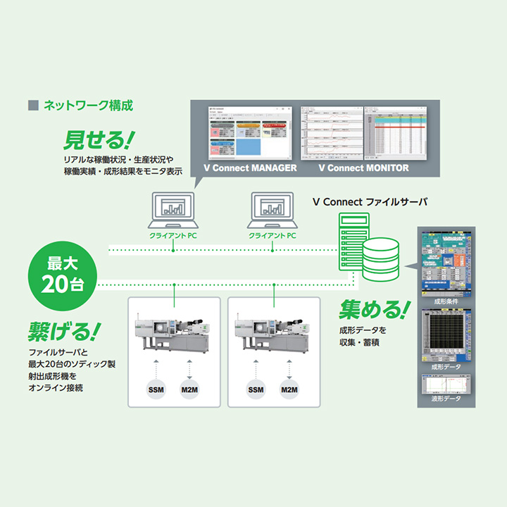 成形アプリケーション HOME製品情報産業機械成形アプリケーション ソディックは、射出成形現場の生産性を向上させる様々なアプリケーションを提供しています。 IT / IoT関連ツール V Connect Plus成形システム全体情報を一元管理できる総合管理システム品質管理遠隔サポートM2M成形機と周辺機器の一元管理を可能にする設備間通信機能周辺機器管理 安定成形サポート機能 ※ 横にスクロールしていただくと全てご覧いただけます。Nendy-EV-LINE®射出成形機に取り付けるだけで、樹脂材料の溶融粘度測定が可能になります。品質管理キャピラリー粘度測定成形ナビ成形条件設定をサポートするアプリケーションシンプルで分かりやすいユーザーインターフェースで、作業を効率化し、オペレータの教育コスト削減に貢献します。作業効率化金型内樹脂情報管理ツール金型内樹脂情報を見える化し、品質管理や金型の評価に活用できます。品質管理NRPsV-LINE®の可塑化機構で高濃度窒素富化環境を維持し、溶融樹脂の酸化による変色や劣化を防止します。酸化防止