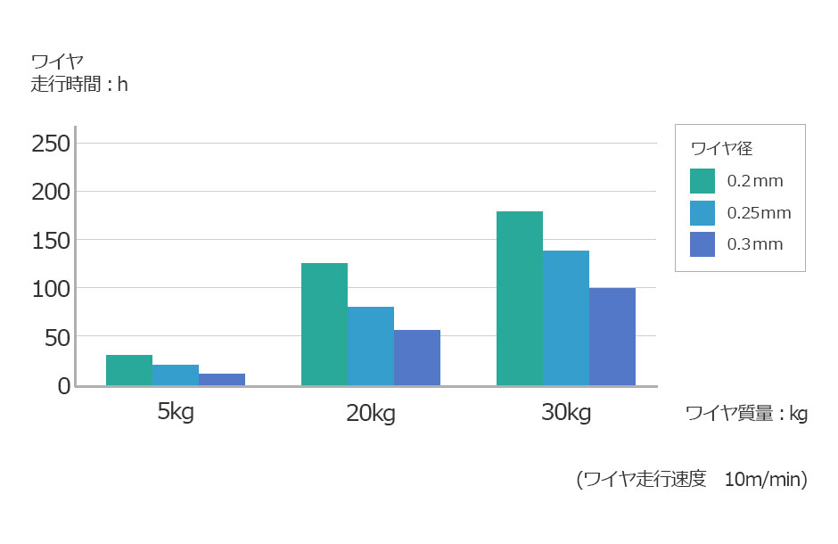 連続ワイヤ走行時間の比較(5kg/20kg/30kg巻)