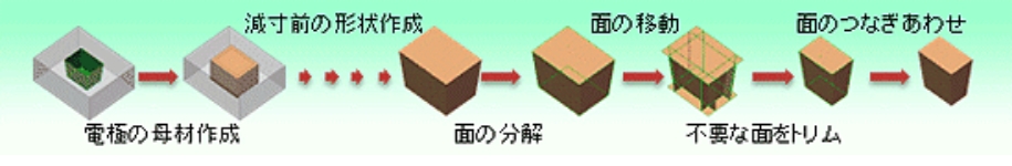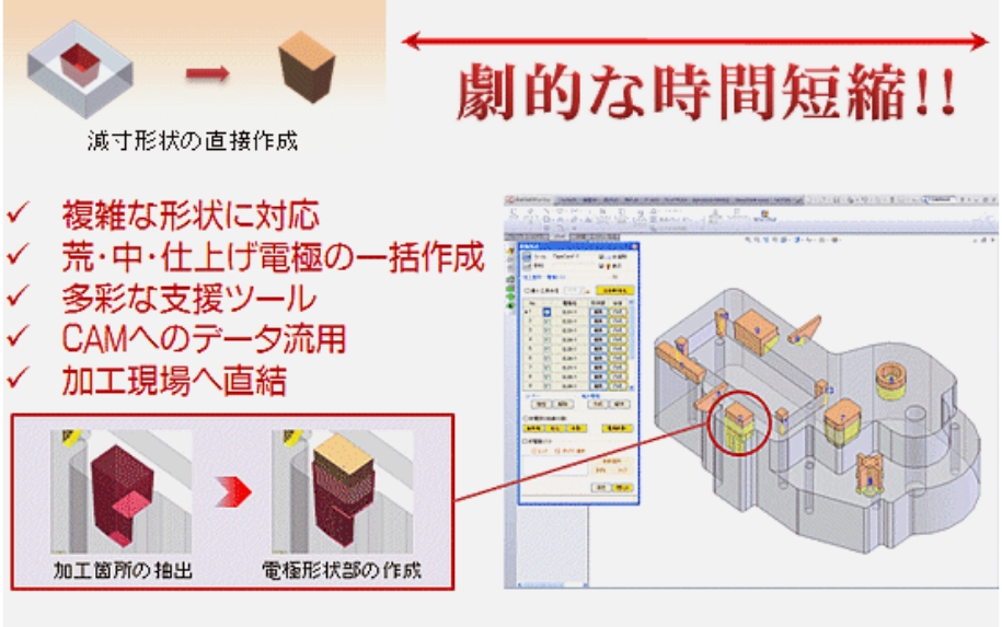 DiProSOLID Loranを用いて電極設計を行う場合、減寸形状を直接作成できるため、作業工程を大幅に削減し、劇的なリードタイム短縮を実現可能です。