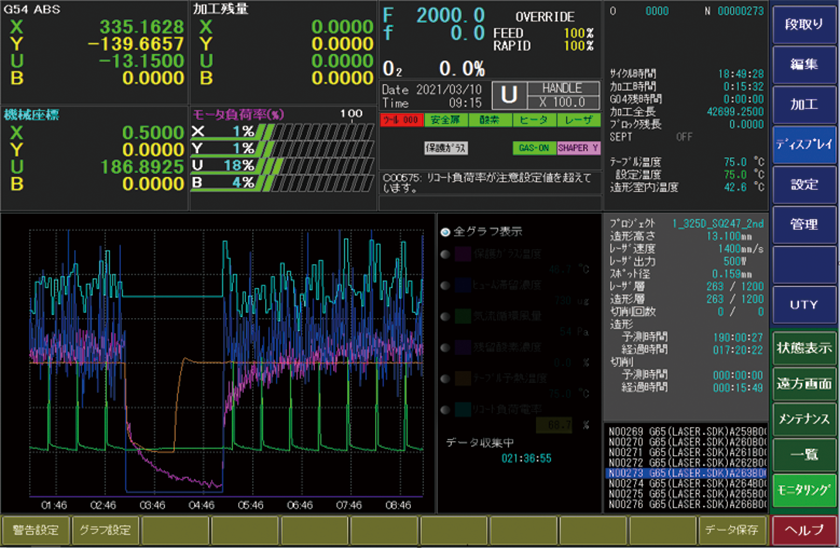 「造形モニタリング機能(オプション)」を搭載することにより、造形物の状態や各部の稼働状況を高度なセンシング技術で常時監視します。造形に関する各データをNC画面で管理・分析することで造形不良を未然に防止します。また、独自のデータ解析により保守点検時期が予測できるため、突発的な機械トラブルも回避できます。これらがチョコ停防止に繋がり、さらなる稼働率向上に貢献します。