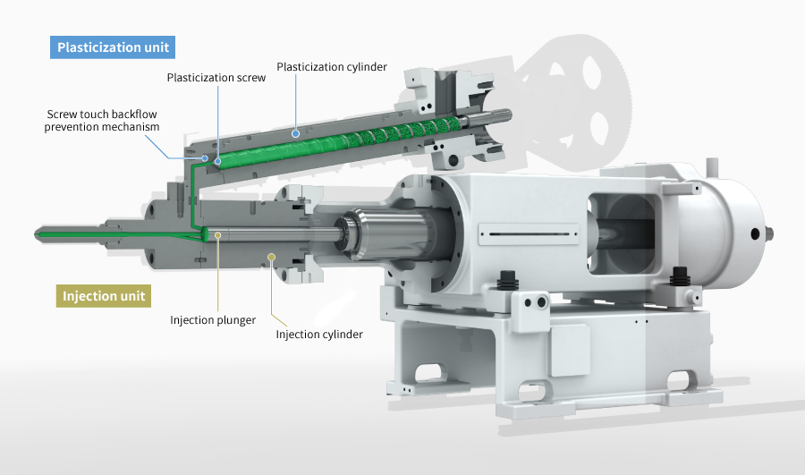 Accurate injection performance with high repeatability was realized by the in-house developed servo motor control technology to the V-LINE® method. It consists of a plasticization unit that only performs plasticization, and an injection unit that performs measurement and injection.