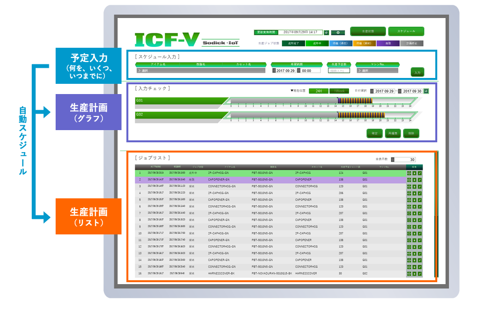 ICF-V Schedulerは、設定画面と状態表示画面の2画面にて構成。設定画面にて、"何を(必要な成形品)"、"いくつ(必要個数)"、"いつまでに(希望納期)"の3つを入力することで、ホストPCは、自動的に的に生産計画をスケジュールします。次に、その生産計画に沿って、成形機(MR30)や周辺機器に指令を出し、自動的に、成形品を生産します。