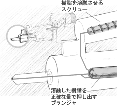 そこでソディックはこの成形の不安定な要因を排除するために、材料を溶かすところと、金型に樹脂を流し込むところを分離した新しい構造を採用することに決めました。