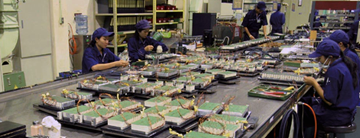 Here wire harness is assembled by binding wires and cables together. Workers on wire harness production line bundle cables together to make wiring assemblies using a harness board which acts as a wiring template. One distinguishing feature of this particular line is that it is staffed by many female employees.